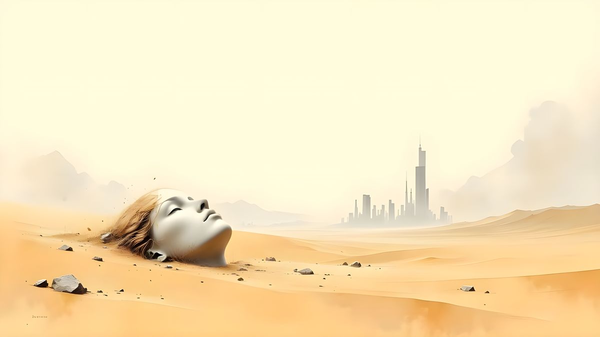 A desolate landscape features a partially buried marble head in golden sand. A shimmering cityscape appears distantly under a pale sky in this minimalist illustration. The color palette is muted with beige, gray, and gold tones.