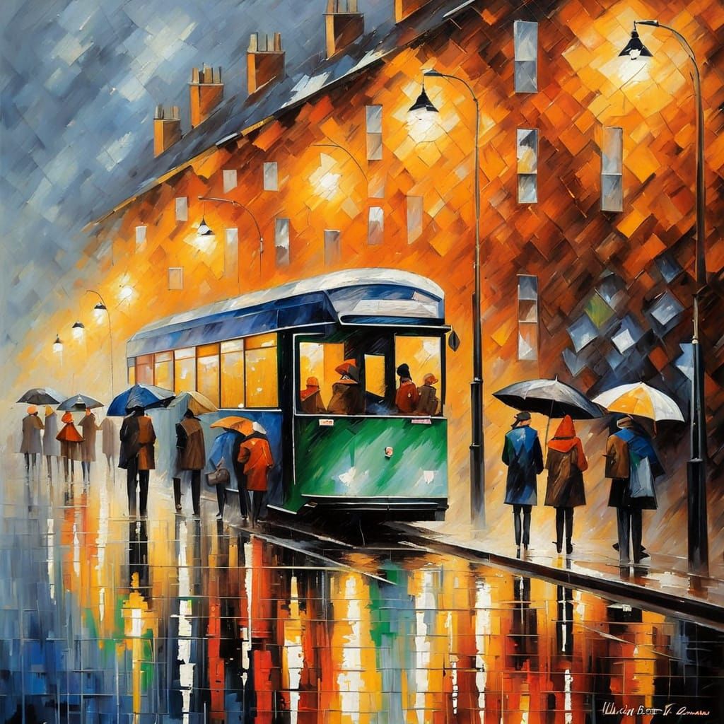 This image depicts commuters at a bus stop during a rain shower. The artwork features thick impasto and palette knife techniques, evoking a vibrant, textured feel.