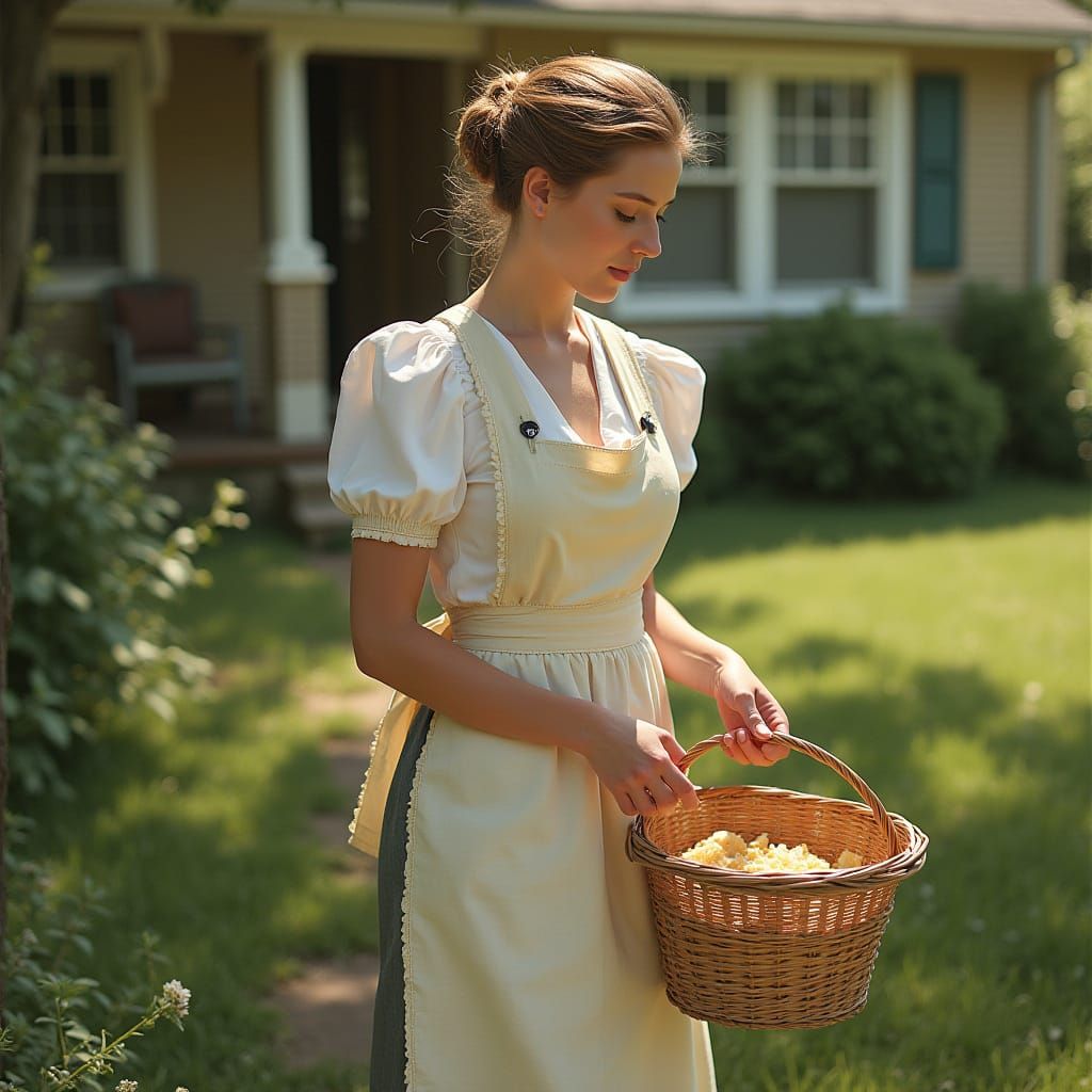 This image shows a young woman in a 1950s dress and vintage apron, performing daily chores outdoors. The scene is set amidst lush greenery, evoking a cozy, nostalgic mood with photorealistic qualities.