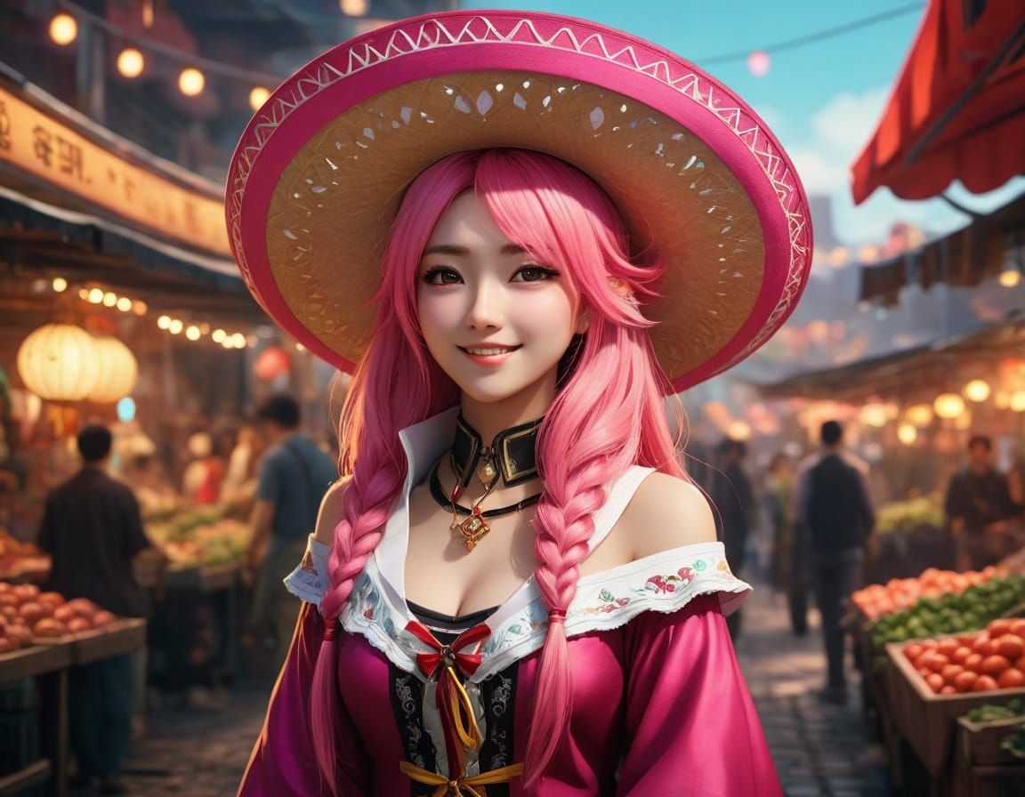 Concept art featuring a smiling woman with pink hair in a vibrant, anime-style sombrero and fantasy outfit. Set against a lively street market during golden hour.
