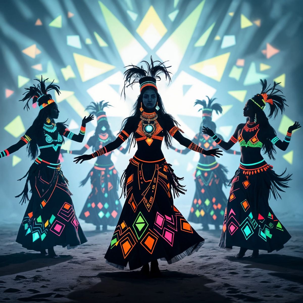 This image showcases tribal dancers adorned with glowing geometric patterns, capturing a magical and primitive artistic style.
