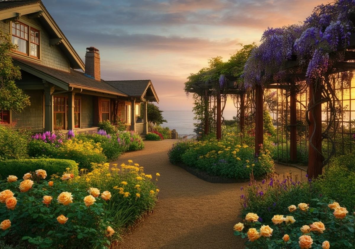 This enchanting image depicts a craftsman cottage surrounded by lush gardens filled with vibrant yellow roses, redwood trellises, and blooming wisteria, set against a breathtaking Pacific Ocean backdrop in a fantastical, 8k-resolution scene.