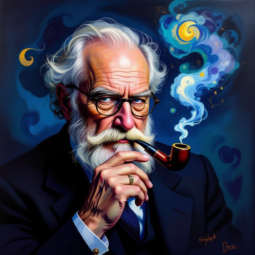 This image shows a surrealist oil painting of Carl Jung, pipe in hand, lost in thought. Abstract symbols swirl, rendered with deep colors and dramatic lighting.