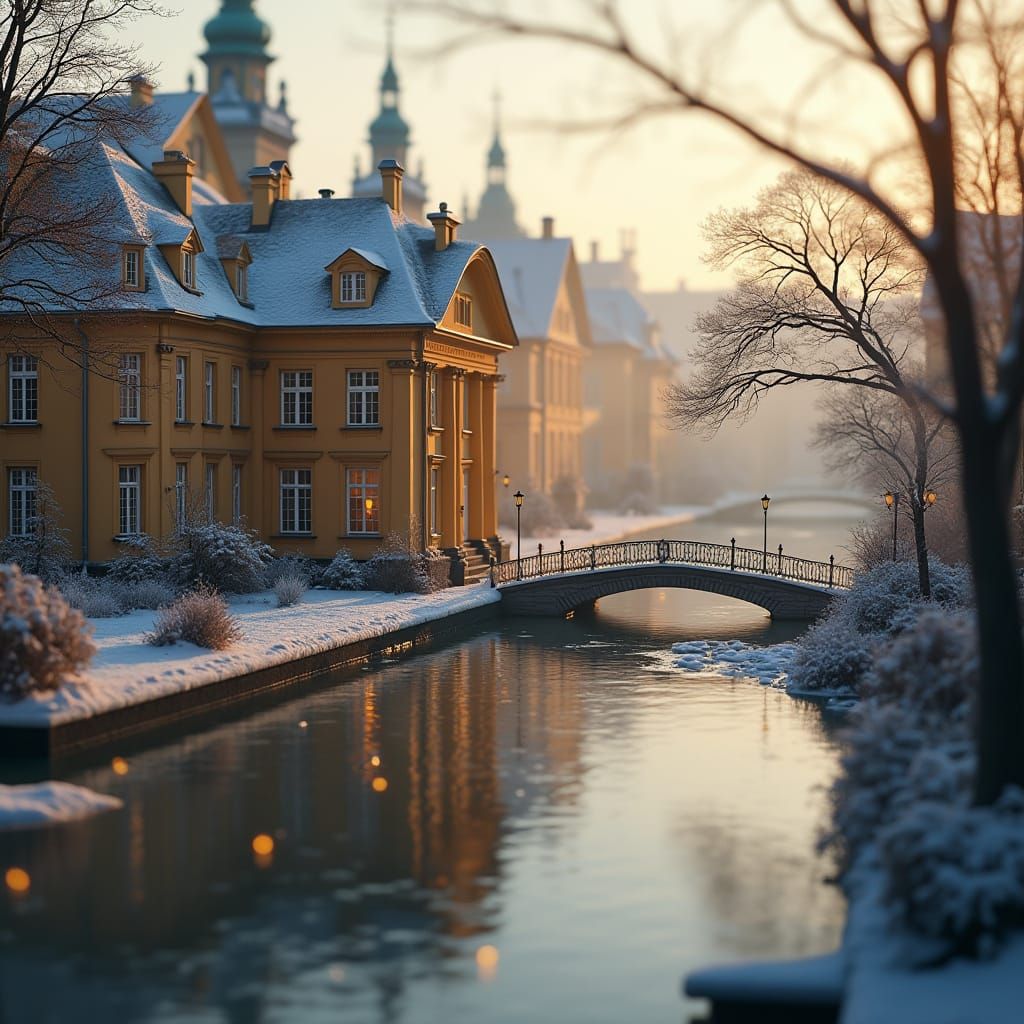 This image showcases a miniature Swedish Neoclassical palace in Stockholm, bathed in a cozy golden afternoon light during an icy winter. Extreme bokeh creates a magical, detailed digital matte painting effect.