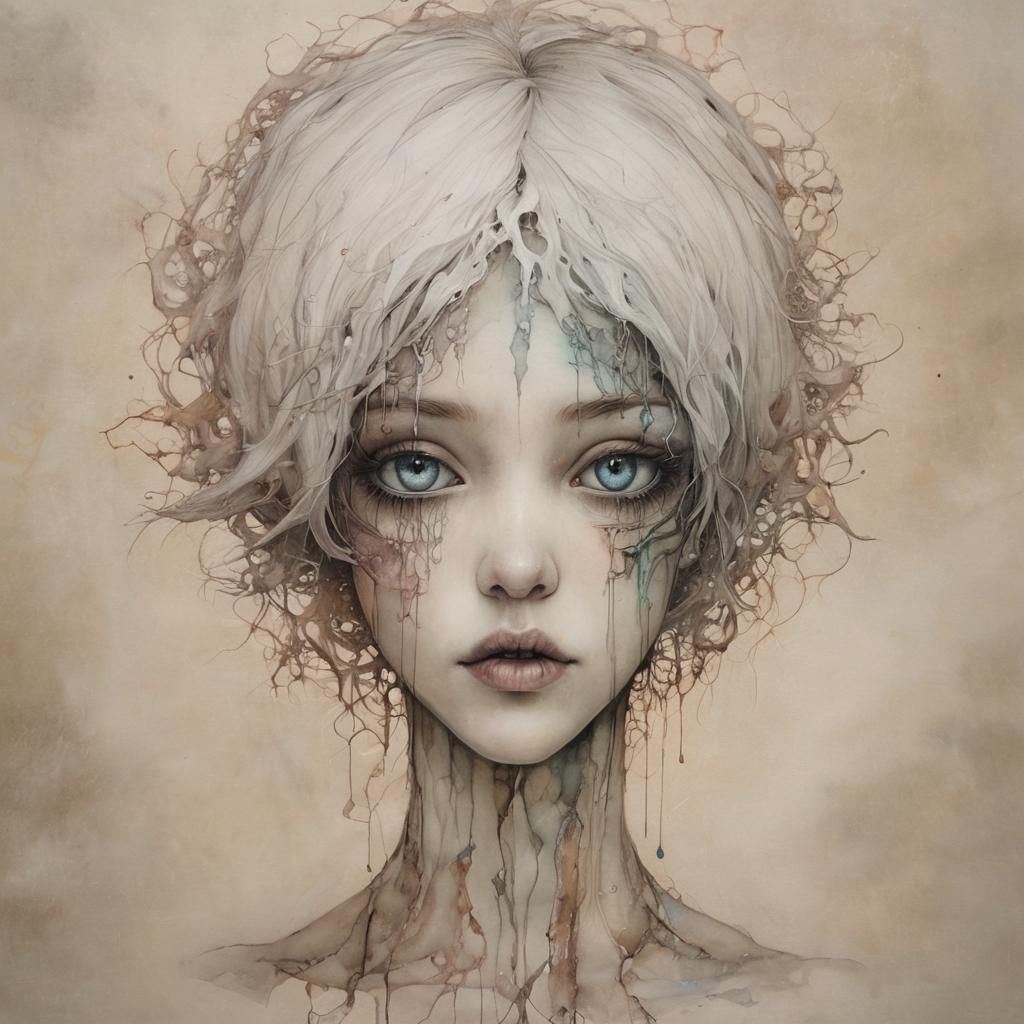This image shows a surreal male figure in a search for inner emptiness. The artwork features a faded, semi-transparent alcohol ink style with hyperdetailed elements.