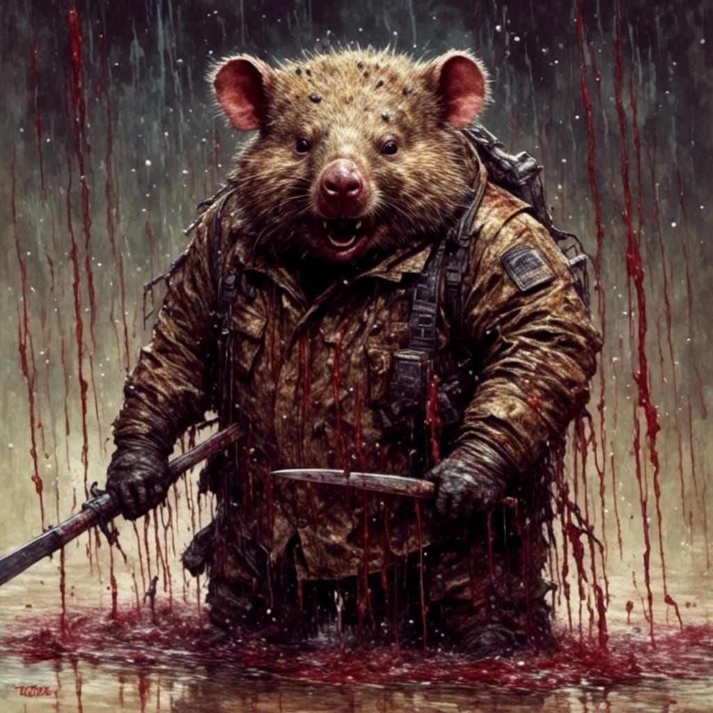 A sinister image of a wombat as Jason Voorhees. The artwork evokes a dark, stylized aesthetic, reminiscent of Greg Rutkowski's detailed and atmospheric style.