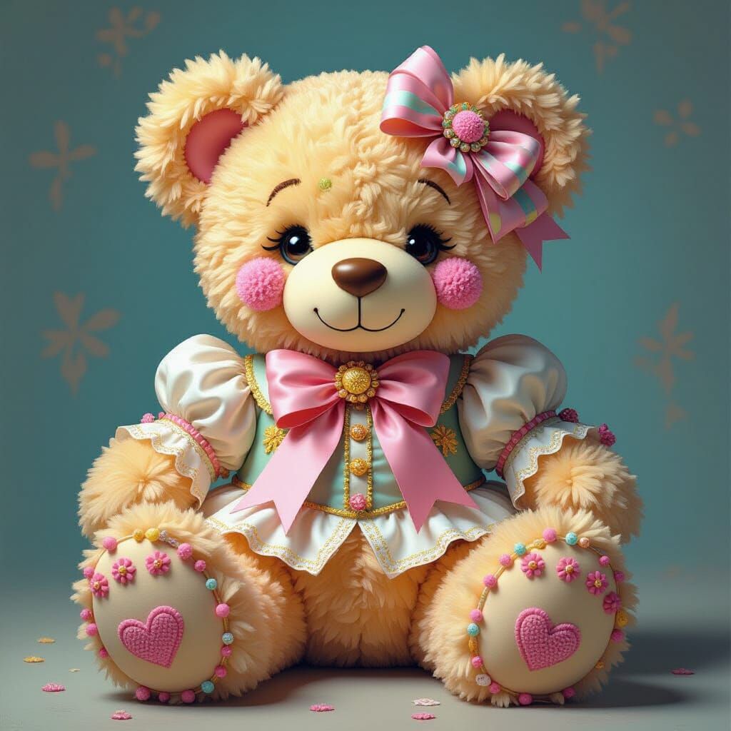 A sweet, gigantic teddy bear dressed in a fancy outfit with ribbons and sugar candies. The image features vibrant, playful details reminiscent of contemporary pop art styles.
