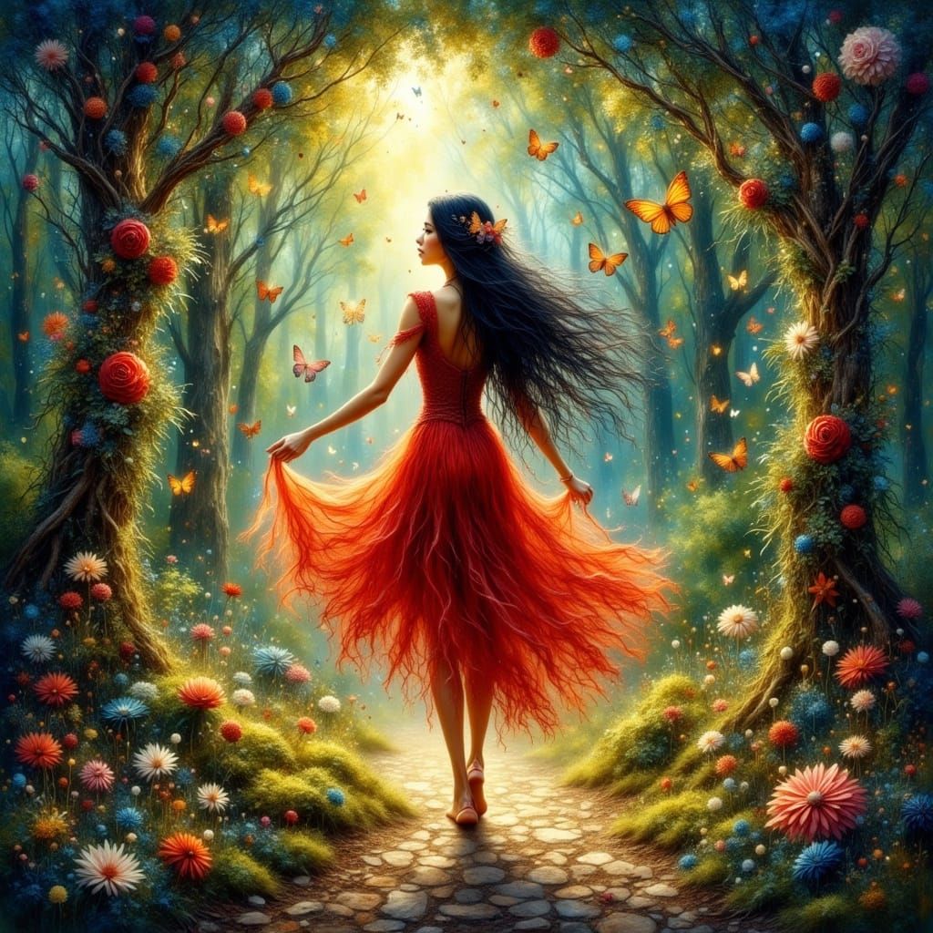 <lora:StarryNight:1.0> <lora:FluxWizardly:1.0> <lora:Beautiful women:1.0> <lora:EtherealVisionsFlux:1.0> create a (full figure front on of a gorgeous elf fairy dancing down a mossy walkway, she has long black hair and is wearing a red gauzy outfit) on a forest pathway, the pathway is illuminated by the ...