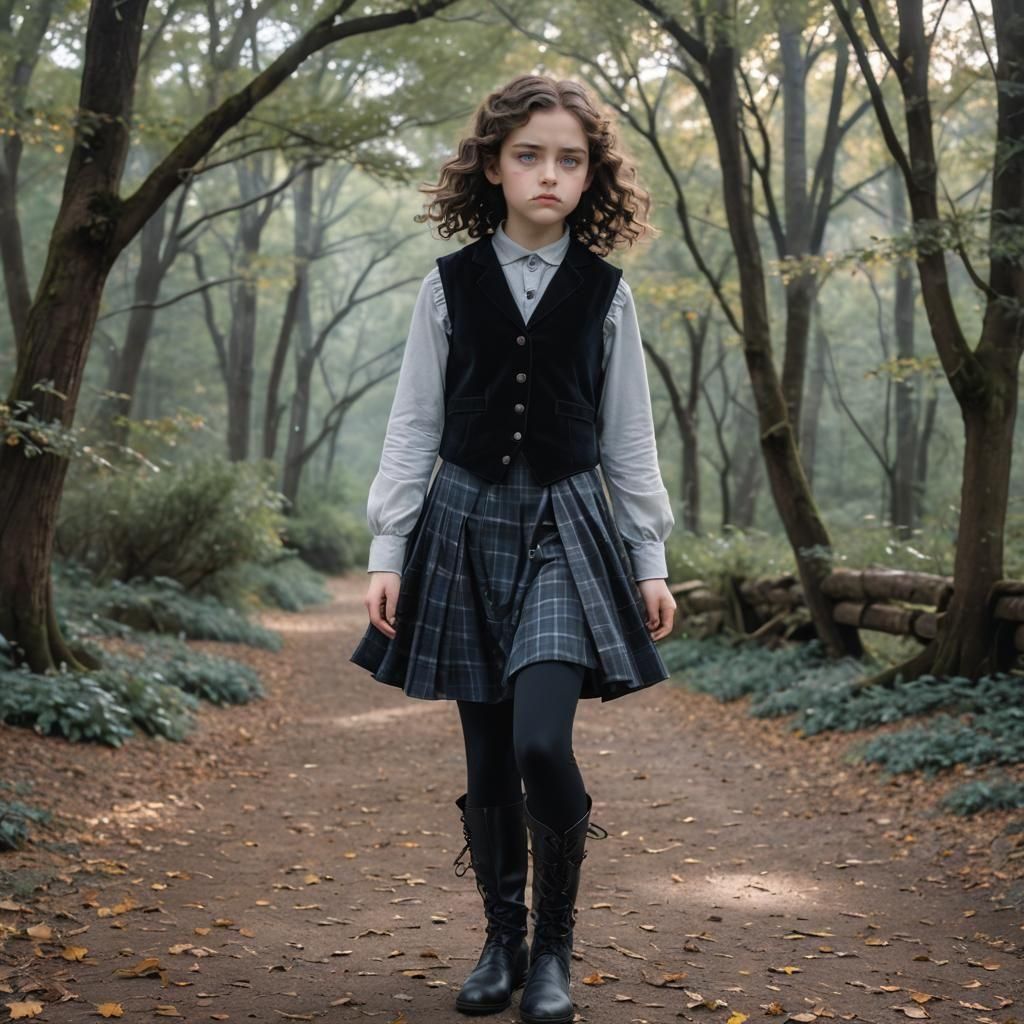 A young girl with indigo eyes stands before a large glass pyramid. She has curly brunette hair and wears a black and gray plaid skirt with black boots.