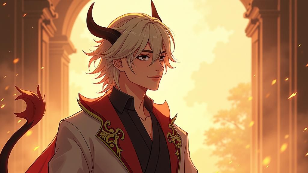 A digital rendering of a handsome, pale demonic creature with platinum blonde hair, black eyes, and short horns. The design blends concept art with realistic anatomy, enhanced by luminous contours.