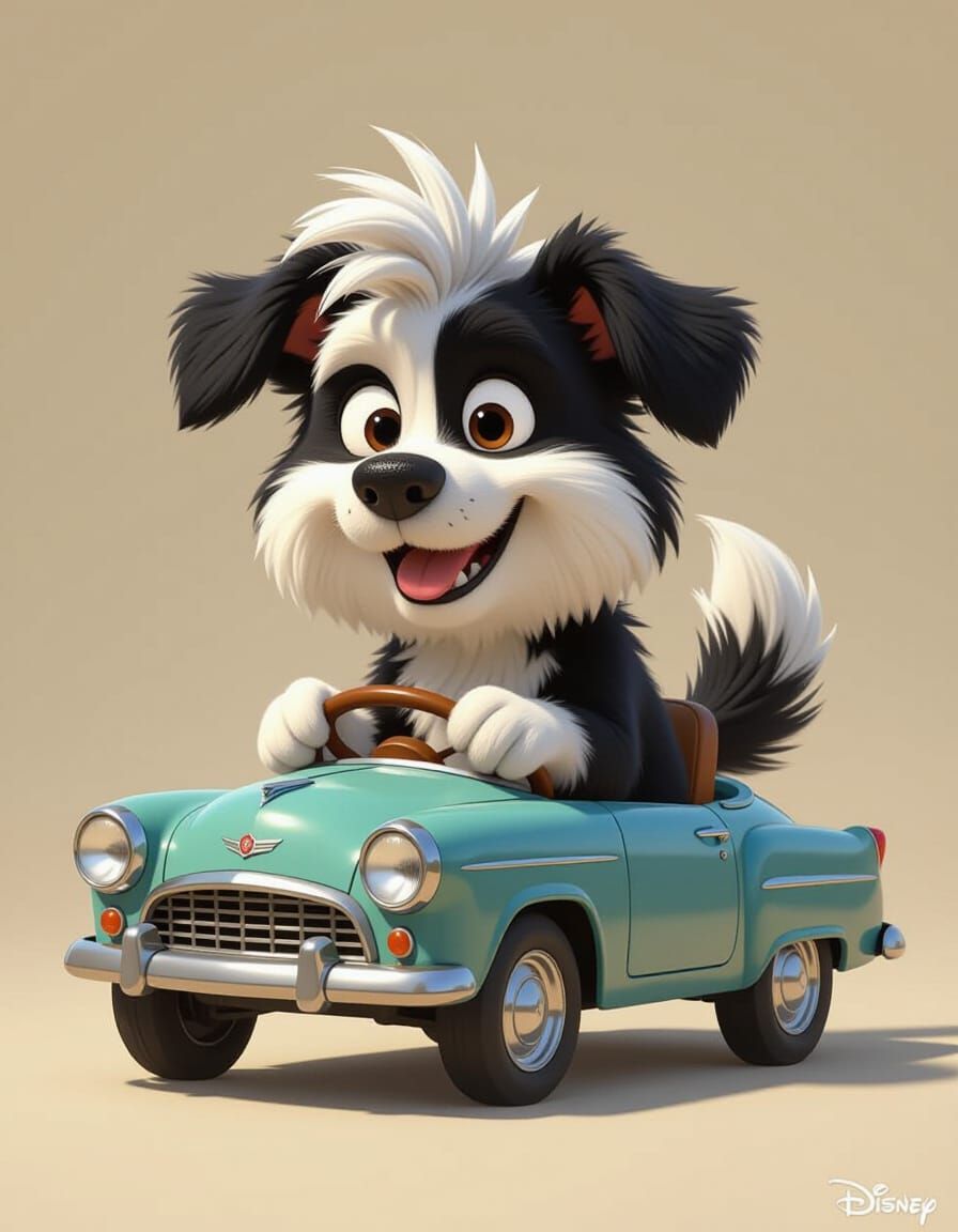 This image shows a black and white dog with shaggy fur driving a toy car. The expressive cartoon style evokes classic Disney and Looney Tunes animation with detailed textures.