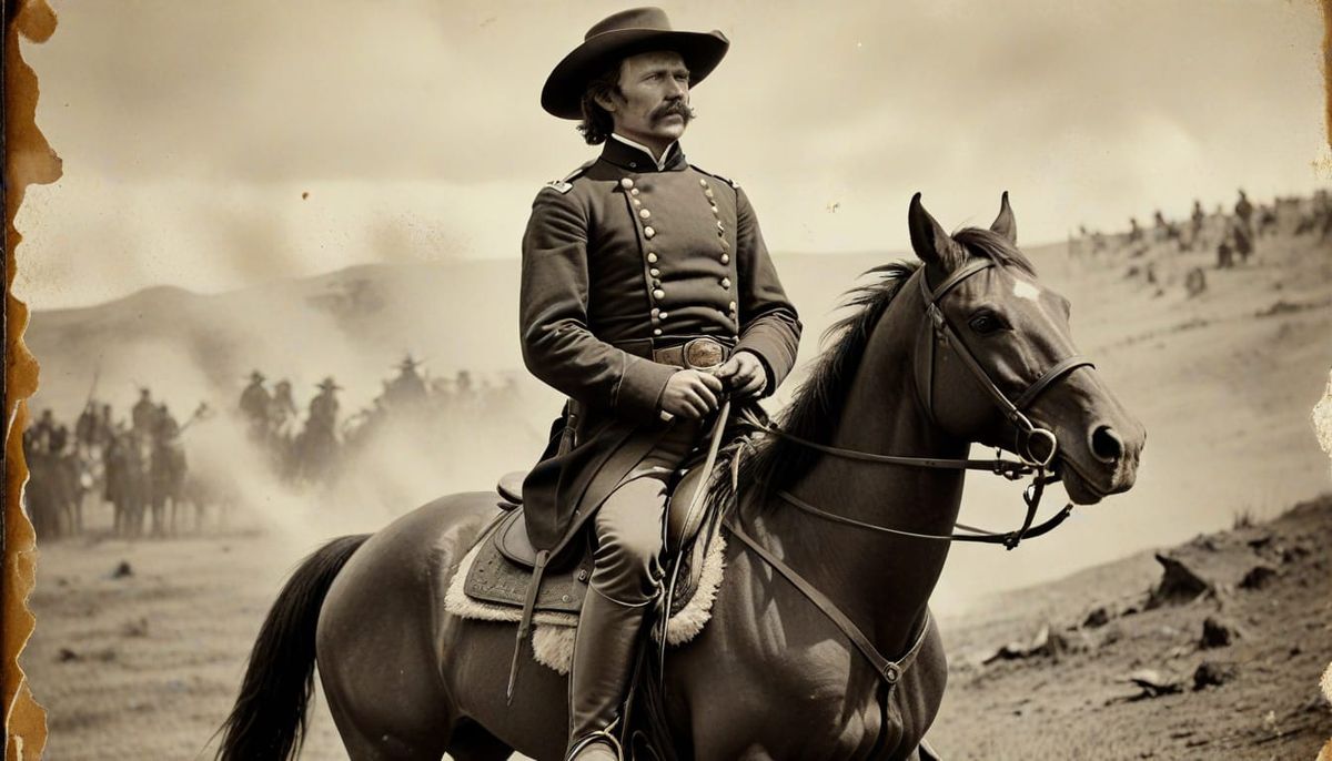 This image shows a worn, vintage photograph of General Custer on horseback, looking out at the Battle of Little Big Horn, with a distressed, sepia-toned aesthetic reminiscent of 19th century photography