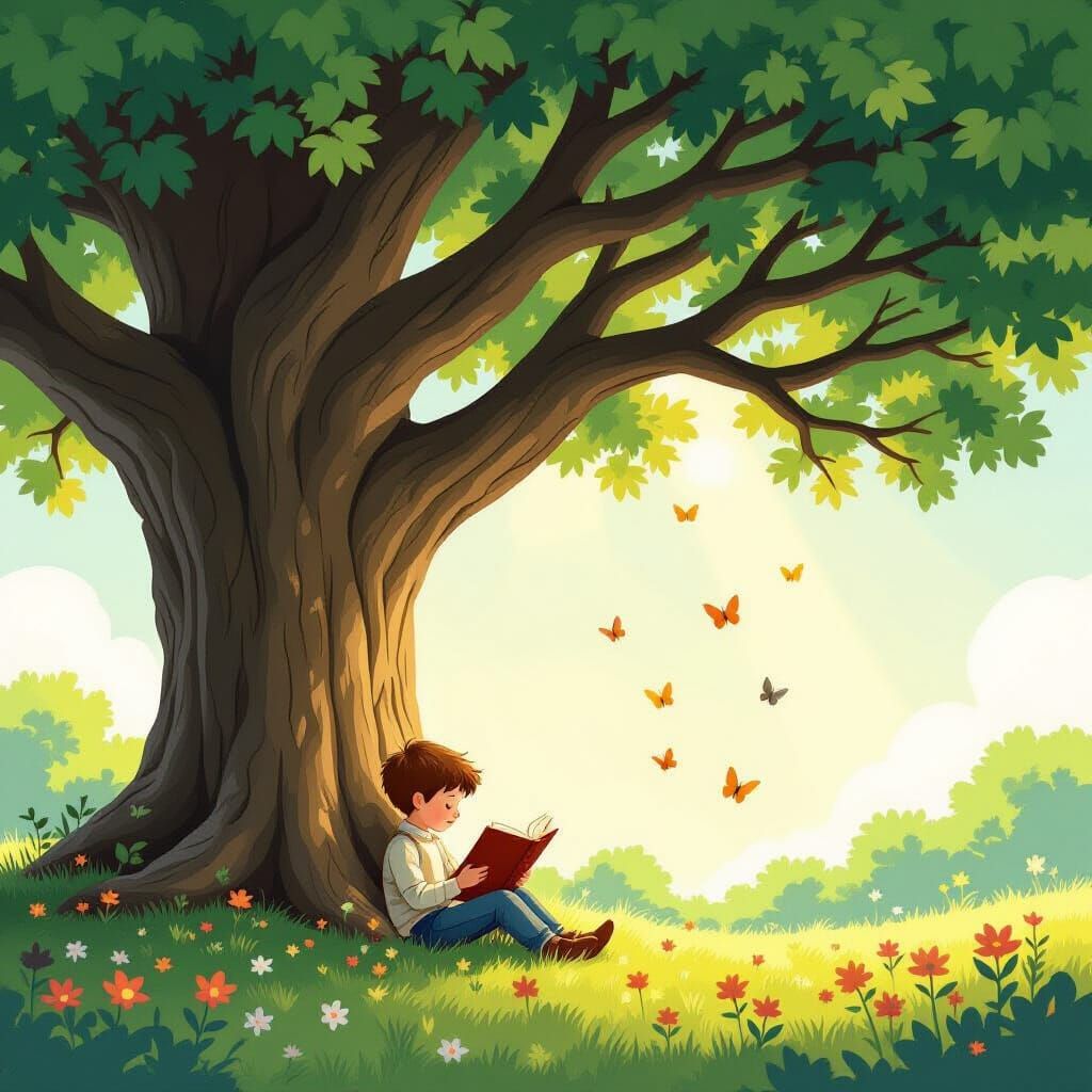 This image shows a young boy reading a book under a large oak tree with sunbeams and butterflies. It is rendered in a charming children's book illustration style with soft colors and a magical feel.