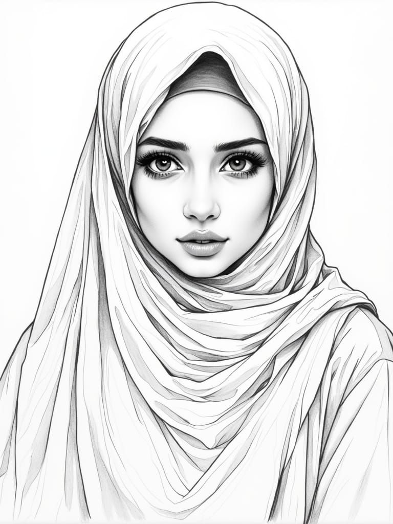 This image is a traditional lineart pen art piece featuring a girl wearing a hijab, characteristic of Islamic art, with a focus on cultural and artistic heritage.
