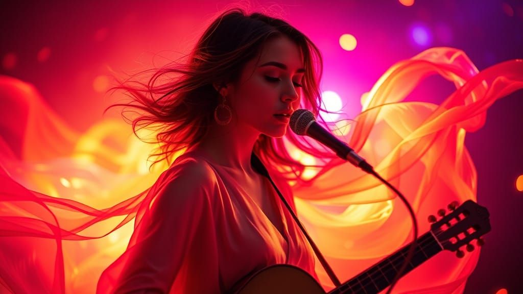 Easily generate your own singer images with flowing attire and vibrant lights using our free AI image generator