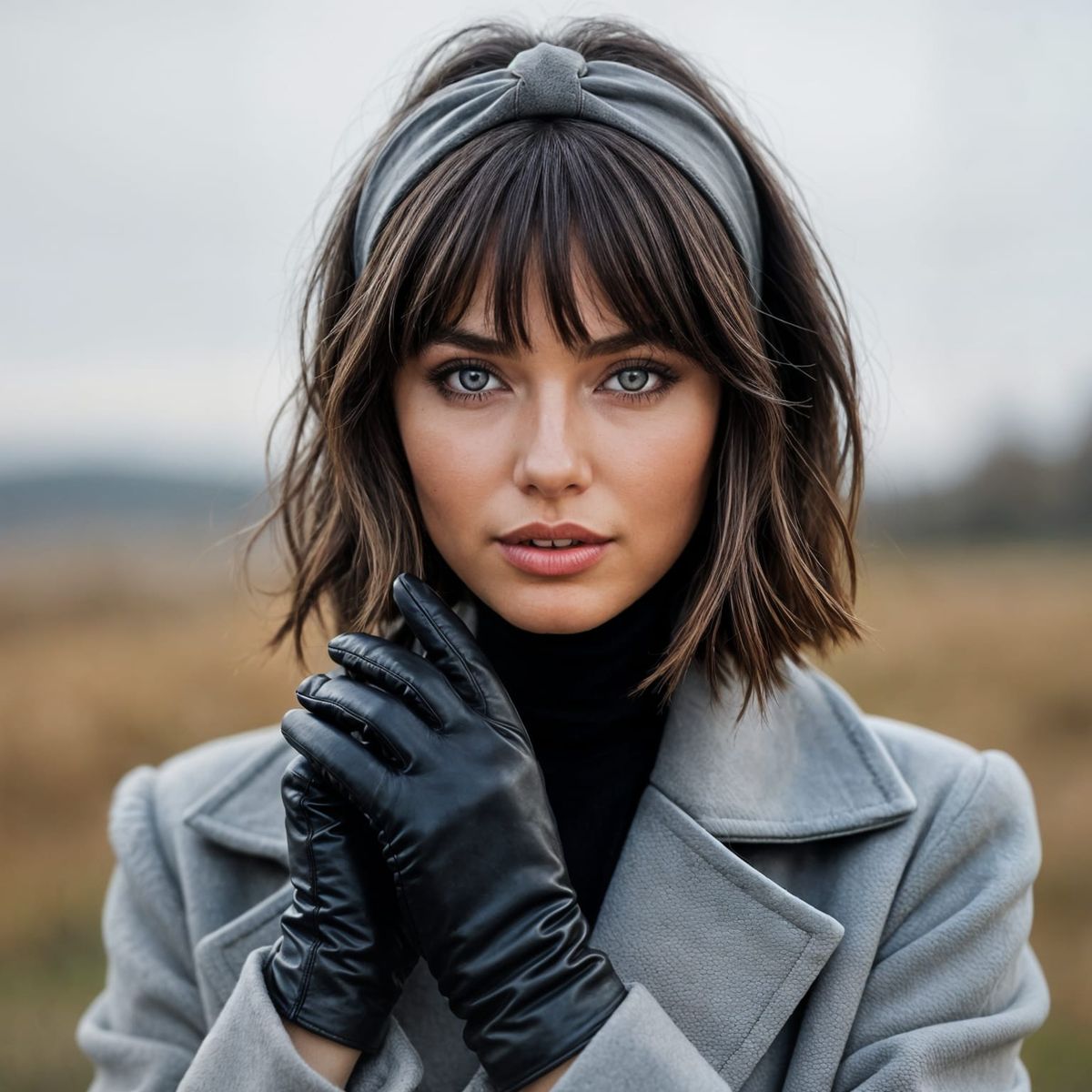 This AI-generated portrait features a short-haired supermodel with brown hair, gray eyes, and a gray headband, dressed in a gray coat and black leather accessories.