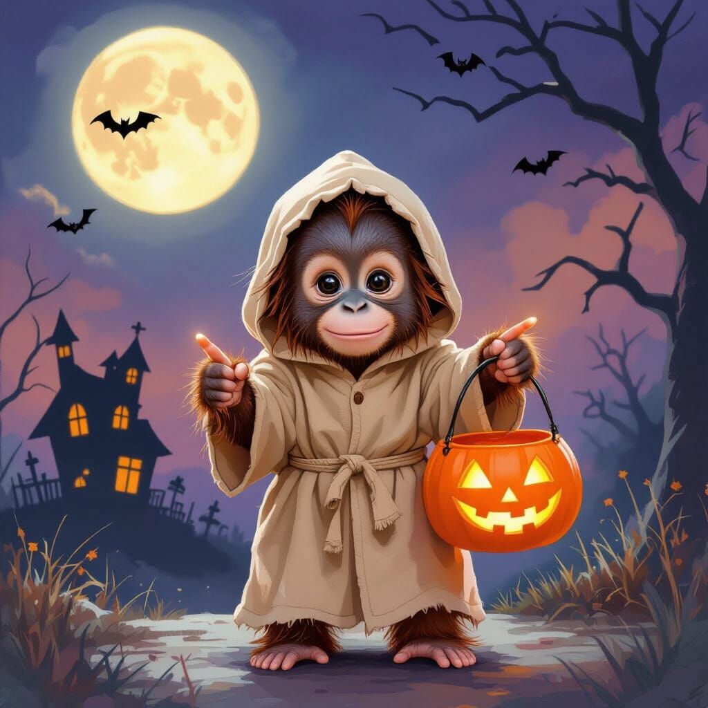 This image shows a baby orangutan in an E.T. costume holding a pumpkin bucket under a full moon. Rendered in a painterly storybook style with warm tones and cinematic lighting.