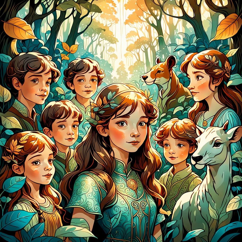 This enchanting portrait depicts happy children surrounded by friendly zoo animals in a lush fantasy forest, set against a backdrop of warm and cool contrasting colors, reminiscent of Art Nouveau's elegant line work and delicate textures.