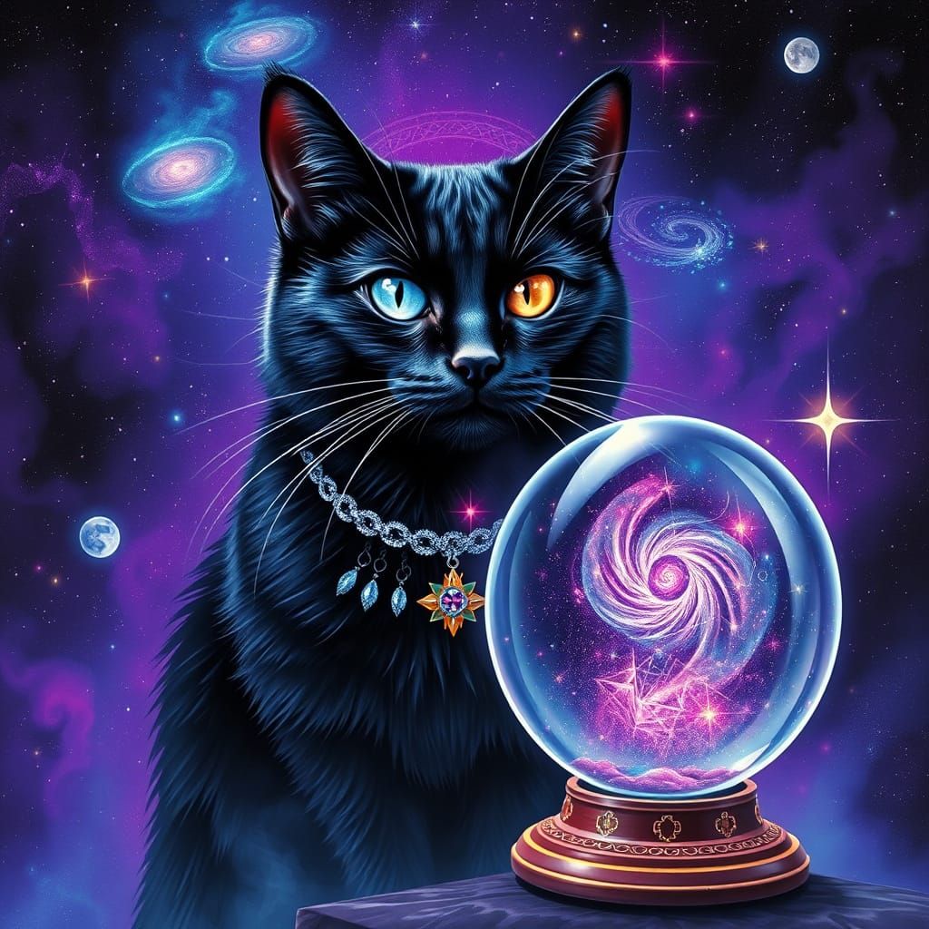 A striking picture of a black cat with heterochromia standing before a crystal ball. This digital art piece features a galaxy, tarot card, constellations, and arcane energy in a holographic astral style.