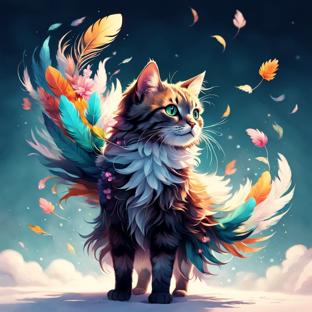 This whimsical illustration features a cute cat adorned with delicate floral patterns. A girl stands on its head, gazing into the distance as wind animates their hair and clothes amidst floating feathers.