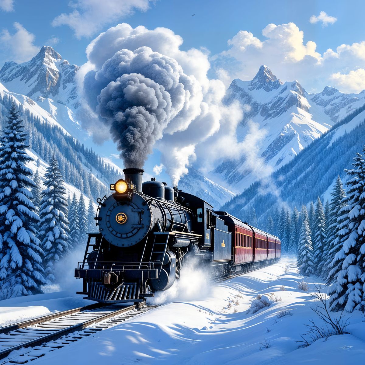 Generate unique steam locomotive images set in snowy mountains with our free AI tool. Easy and fast!