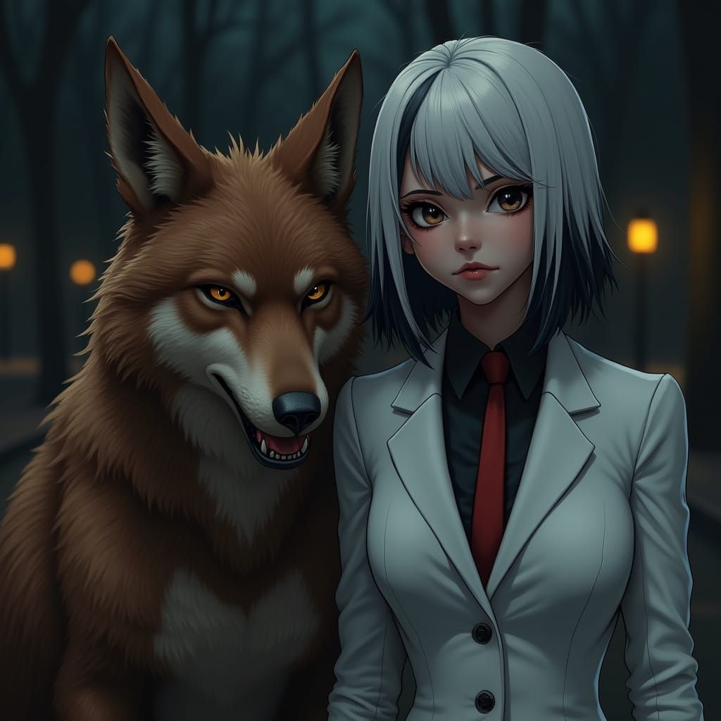 This image shows a woman with striking streaked hair in a white suit, standing next to a werewolf in Boston Commons. The scene is dimly lit with soft street lamps, rendered in a hyper-realistic and atmospheric style.