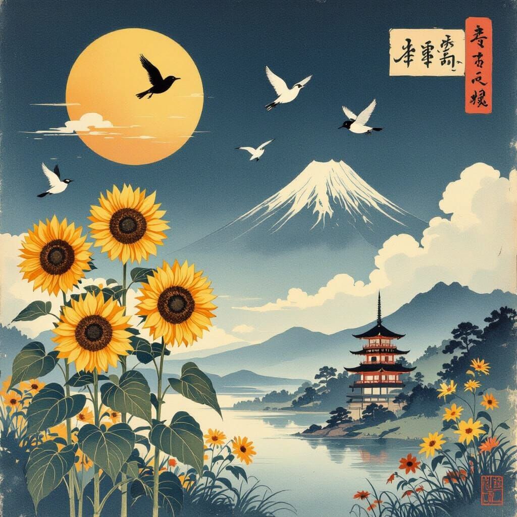 A serene Japanese landscape featuring sunflowers and birds in a warm, joyful scene. This minimalist Ukiyo-e style artwork features intricate inksplash textures reminiscent of classic masters.