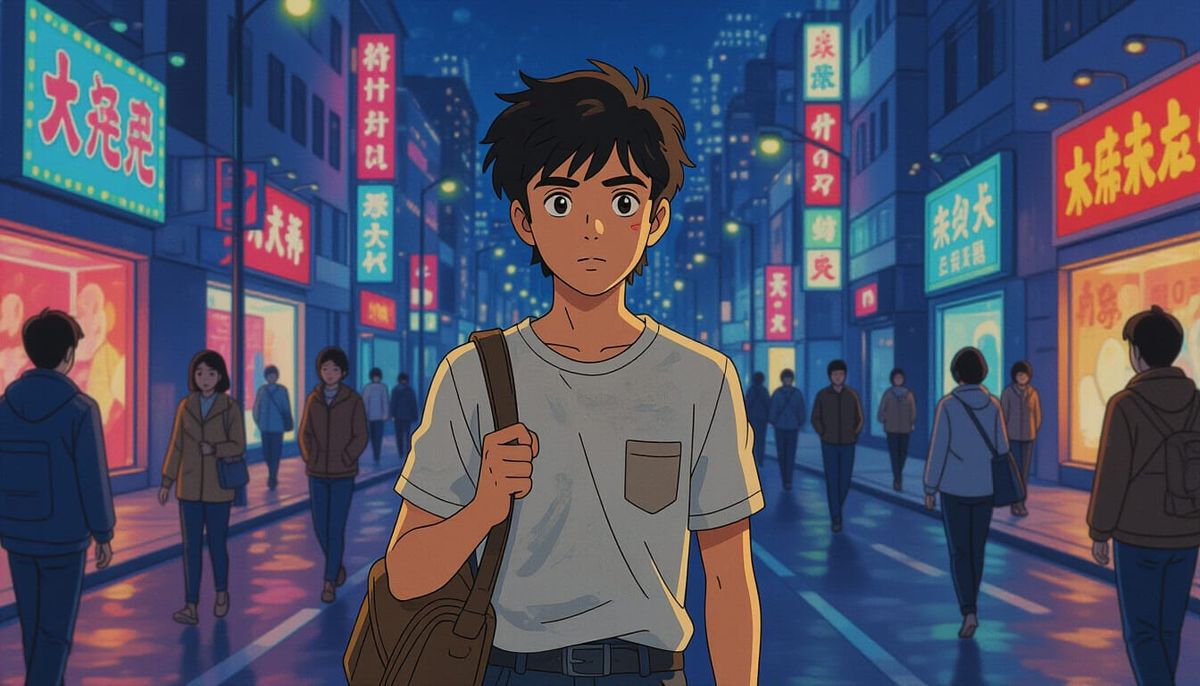 This image depicts a focused 19-year-old Indian boy walking through a vibrant, crowded city at night. Rendered in an inspirational anime key visual style, the scene captures his solitary journey amidst the urban bustle.