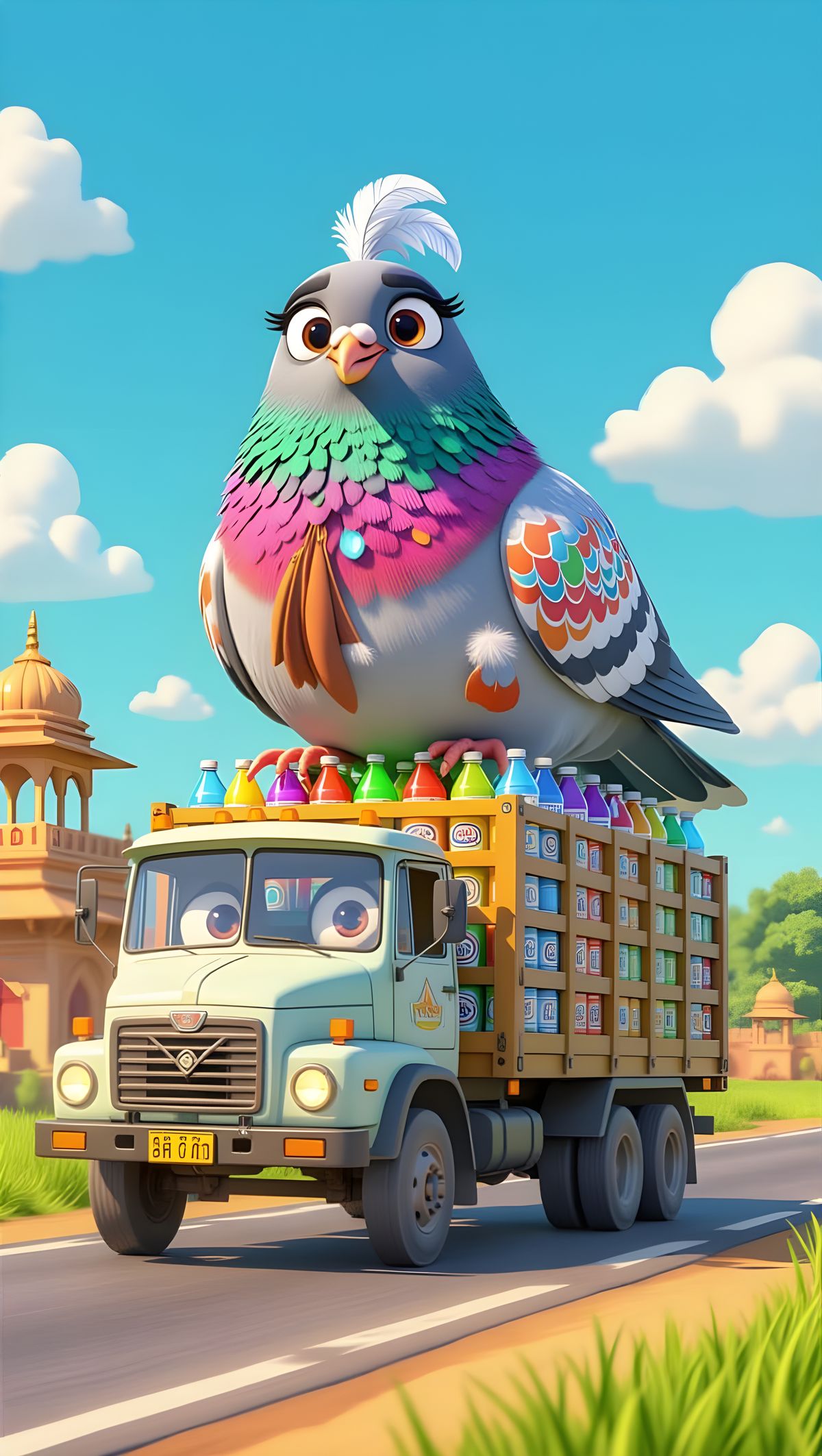 A 3D realistic image of a large, nervous pigeon sitting on a colorful moving truck, driving down a narrow village road towards a small Indian-style palace in a sunny green grass field