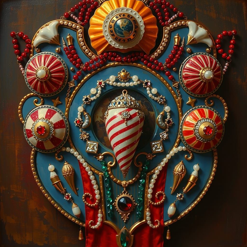 This image showcases hyperrealistic stripes in pink and pale green, adorned with pearls, seashells, baubles, beads, gold, silver, and precious gems.