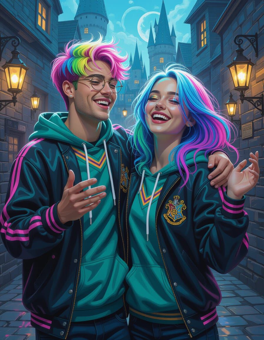 This image shows two mage friends joyfully dancing at Hogwarts. The pair have neon rainbow chrome metal hair and wear outfits with neon turquoise and pink accents in a splash art style.