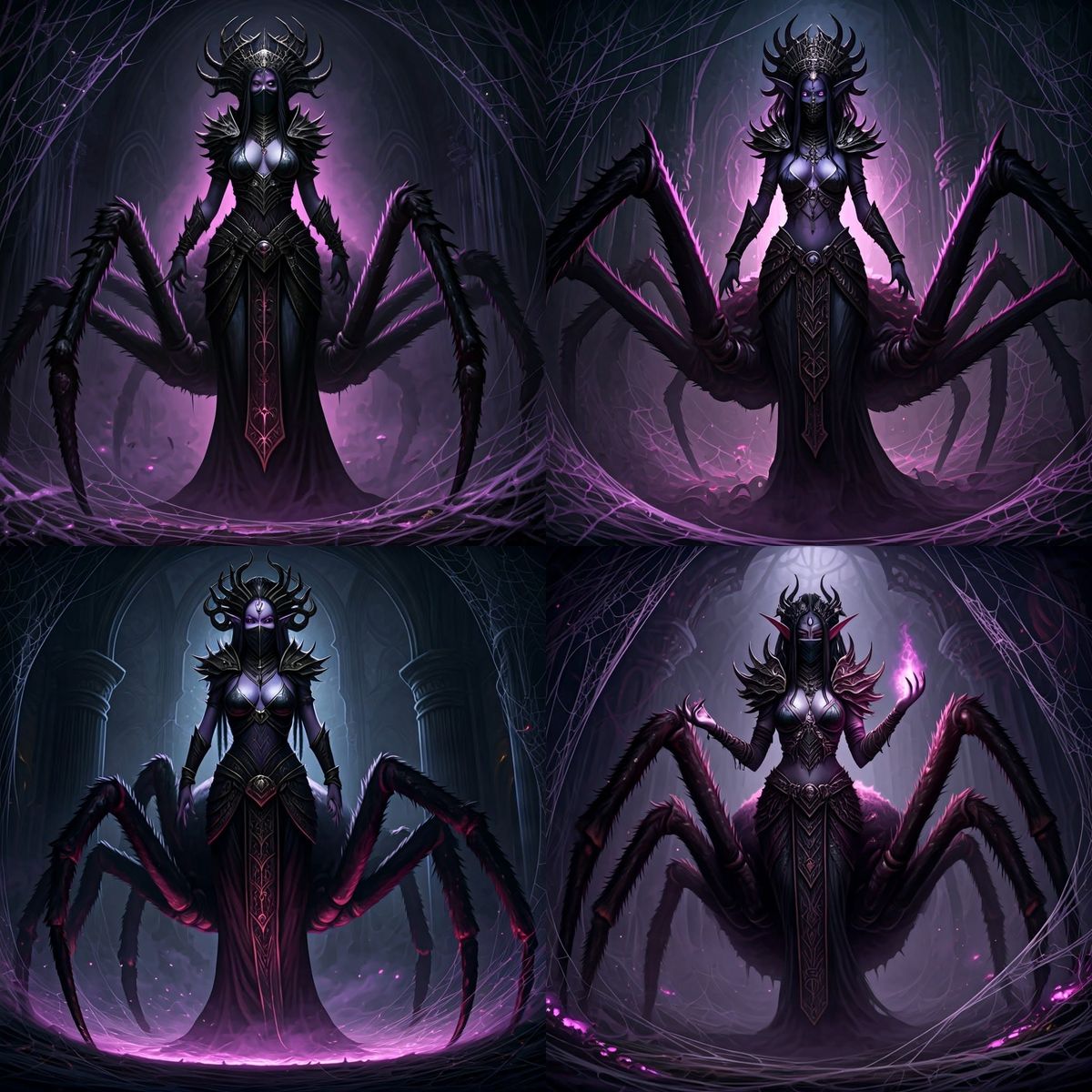 A striking picture of a towering drider priestess in a spiderweb-filled sanctum. The half-dark elf, half-giant spider radiates dark holiness, enhanced by cinematic lighting and a gothic atmosphere.