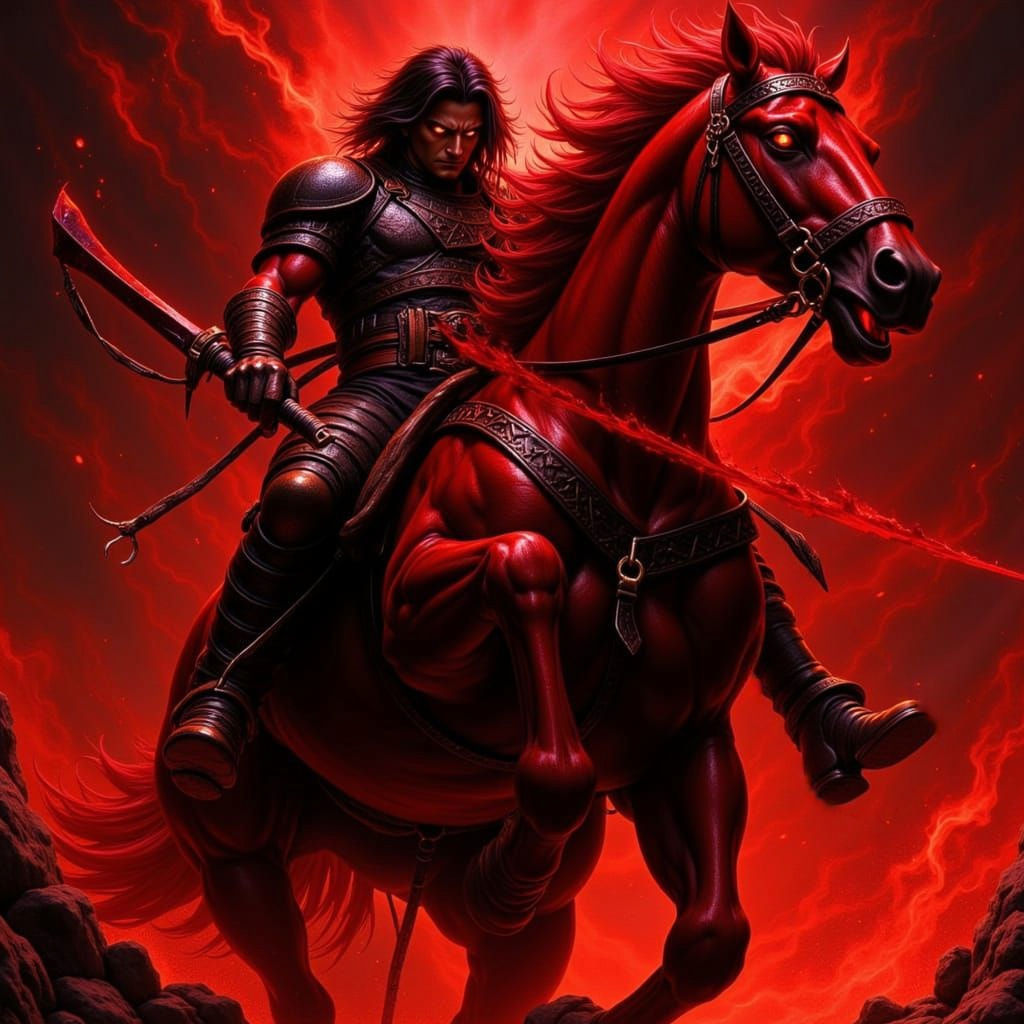 This image depicts the embodiment of War, one of the Four Horsemen, mounted on a powerful red steed, wielding a bloodied sword, a dramatic and intense portrayal.