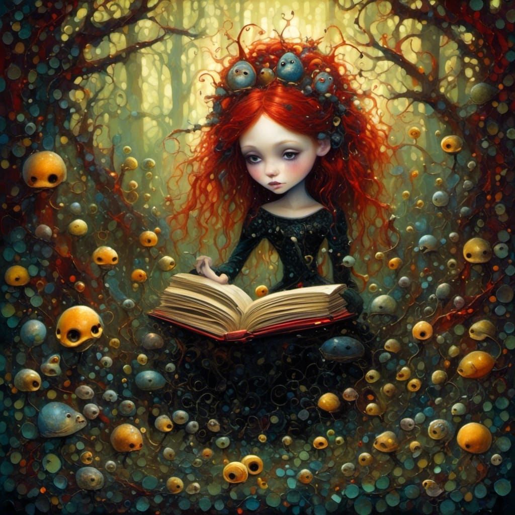 A vibrant image of a red-haired girl reading. She has big, sad eyes and wears gothic-punk clothing. The image is a modern fairytale scene with fine details and complementary colors.