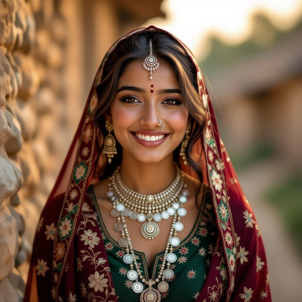 A hyperrealistic image of a young Indian woman in a maroon and green shawl and top, adorned with silver jewelry. Bathed in warm golden hour light, the scene features a soft focus and earthy tones.