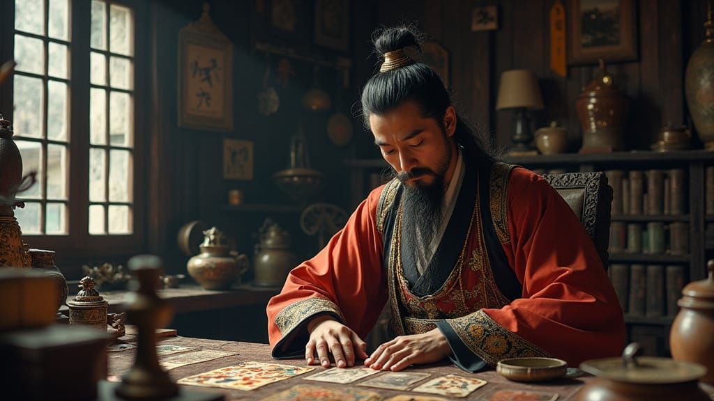 This haunting image depicts a traditional Korean tarot reader in a dimly lit, ornate shop surrounded by mystical artifacts, blending eerie supernatural undertones with authentic Korean motifs.