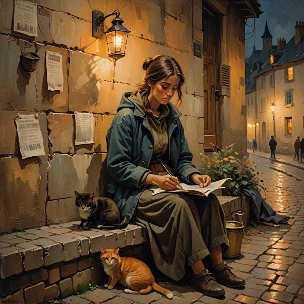 This image shows a homeless girl sitting with a cat, reading a newspaper in a 19th-century French village at night. The image is rendered with warm lighting and soft brushstrokes in an impressionistic style.