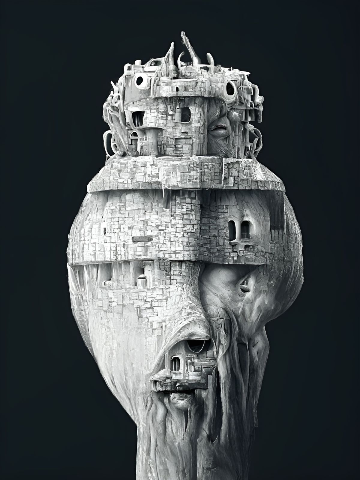 Very odd yet beautiful In the style of Zdzisław Beksiński, castle structure, humanoid head, face
