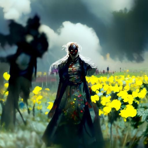 A sinister flower field is depicted in this image. The artwork features a dark, moody aesthetic and intricate details.