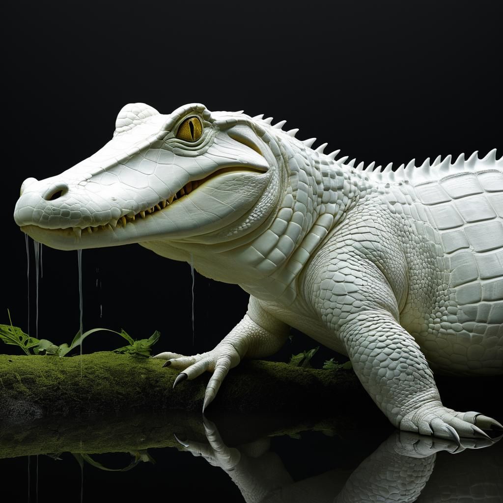 Close-up panoramicrophotograph: “Giant Obese Albino Alligator”; angled profile Clipart, organic forms, in the style of Jon Klassen, desaturated light and airy pastel color palette, nursery art, black background: Telephotography by Stephen Gammell - Gabriel Pacheco - Naoto Hattori - Joan Miró - Russ Mills ...