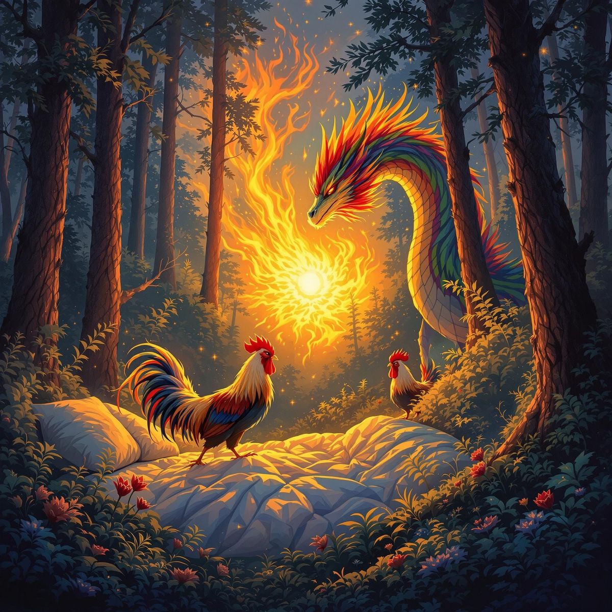 This image shows a vibrant, fire-breathing dragon in a forest setting, igniting the sun at dawn. A rooster emerges from a bed, as elements of fantasy blend with reality.