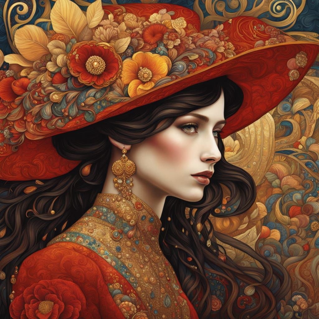 This is a detailed oil painting with chalk textures, featuring a mysterious young woman in an opulent red dress and wide-brimmed hat, adorned with floral patterns and gold embellishments. The artwork is inspired by Klimt.