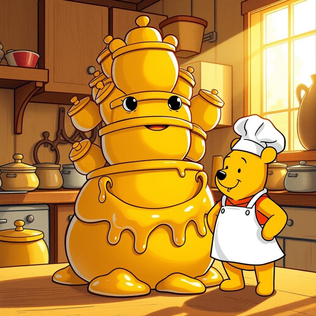 This charming image features a smiling honey pot face, crafted from a stack of colorful pots, with Winnie the Pooh dressed as a chef standing beside it, surrounded by a warm kitchen scene in a classic, cartoon-inspired aesthetic