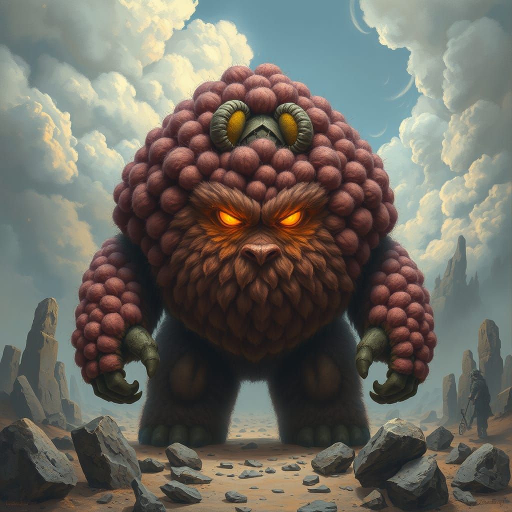 A colossal pom pom golem with glowing eyes stands guard in a desolate, fantasy landscape. The image features soft textures and a gritty, painterly style reminiscent of fantasy art.