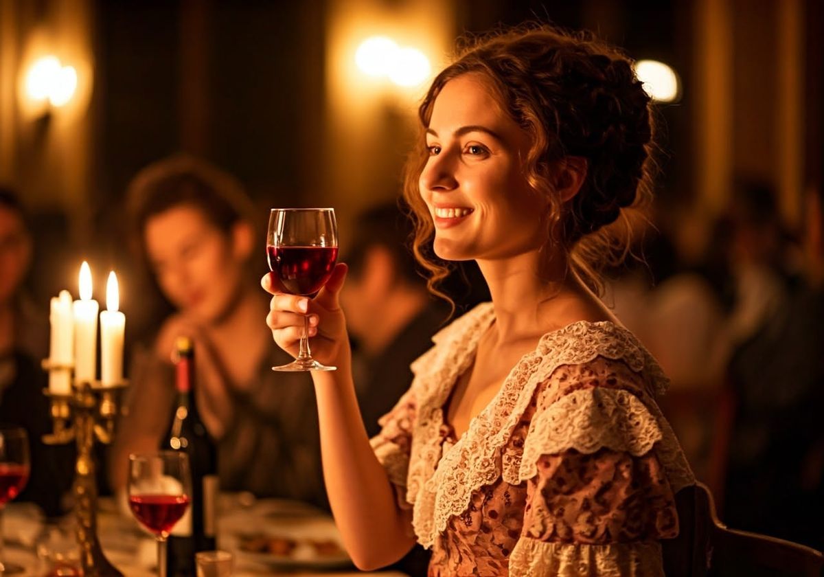 This image depicts a charming French woman from the 19th century, dressed in a lavish outfit, surrounded by the warm glow of candelabras and the whimsical charm of folk art, reminiscent of naive and dreamlike qualities.