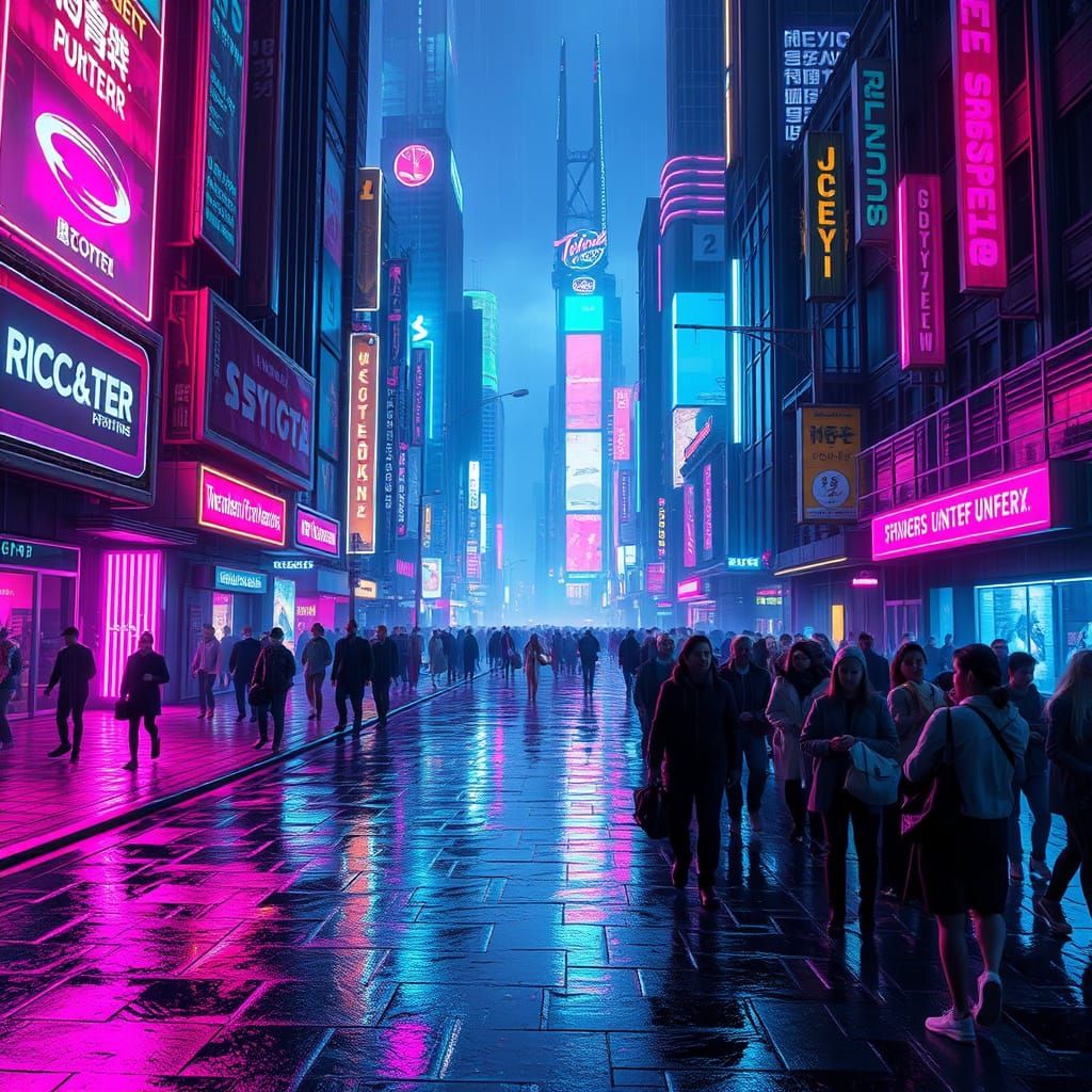 This image shows a futuristic city at night, gleaming with neon lights and holograms. Reflective streets mirror the vibrant magenta and cyan lights in a cyberpunk aesthetic.