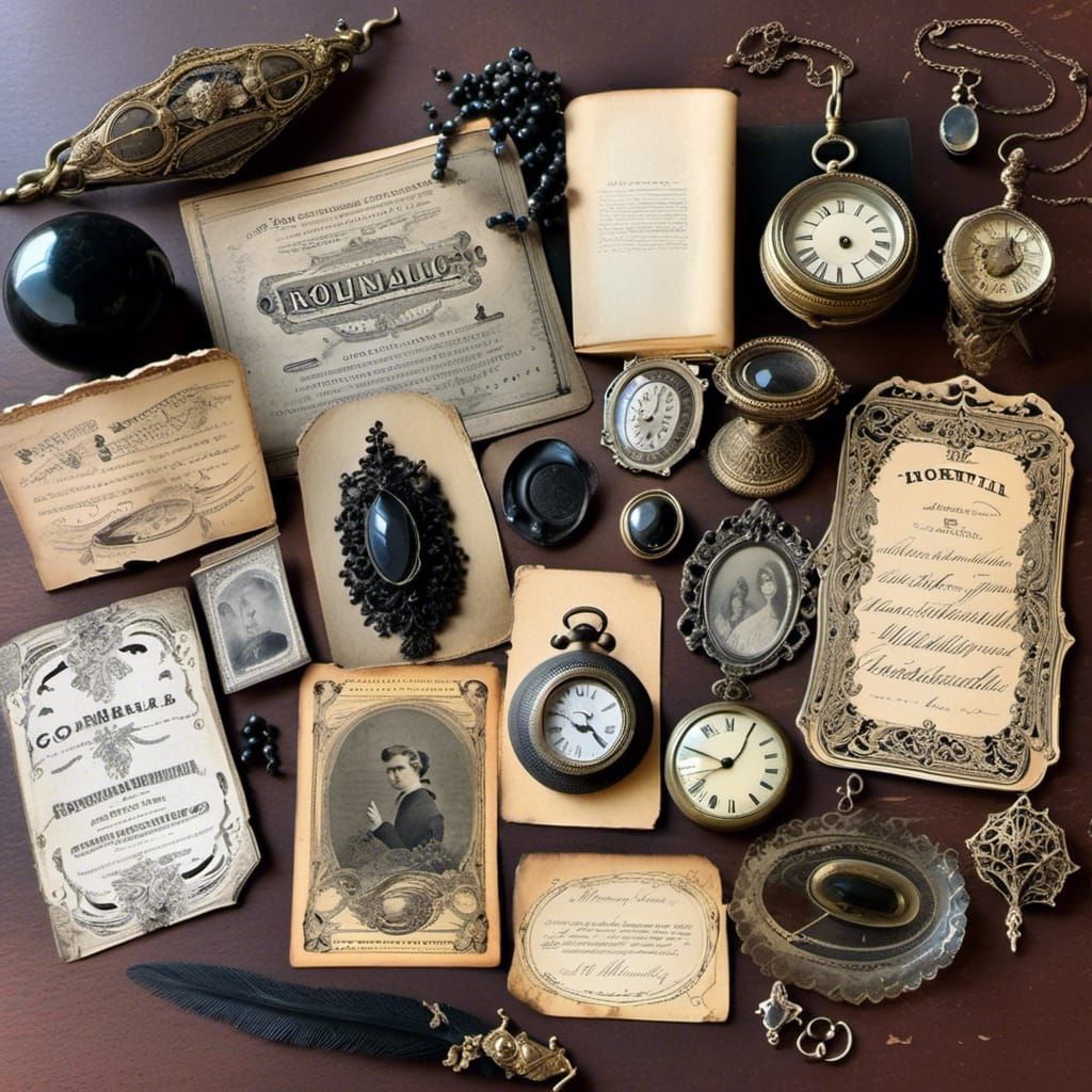 This image shows a curated collection of vintage Victorian mourning accessories, including jewelry, hats, clocks, and lamps, arranged as vintage ephemera for junk journaling.