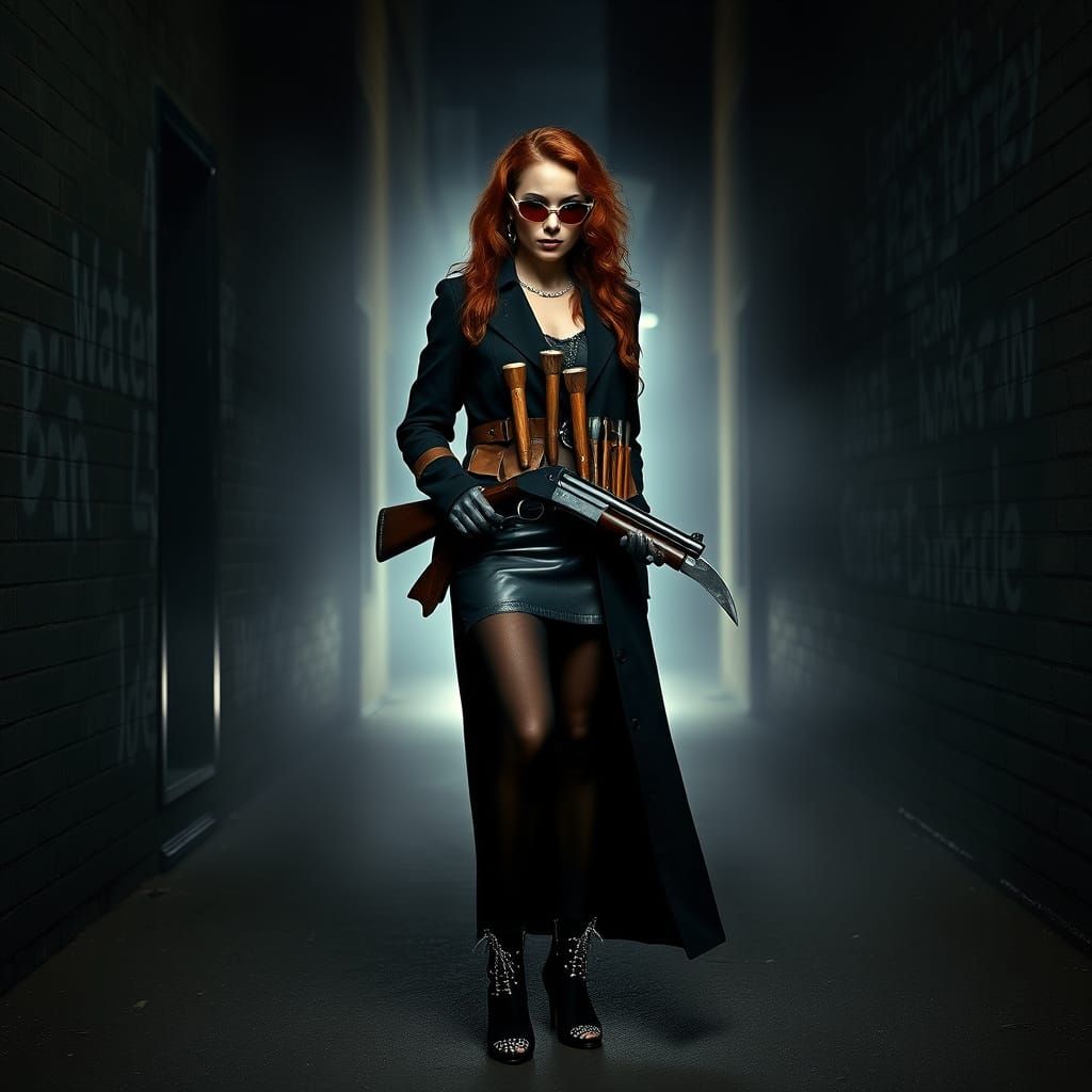 A gothic scene shows an African woman vampire hunter standing in a dark alleyway. She's armed with a shotgun and knife, and dressed in a black trench coat with a utility vest, in a gritty, cinematic style.