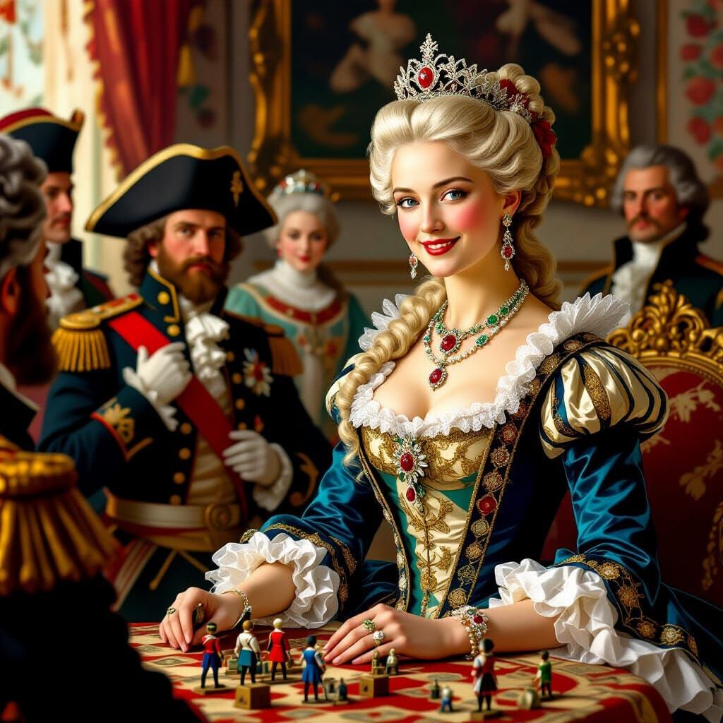 This image shows Catherine the Great observing her husband. The scene, reminiscent of Civilization V, blends Renaissance and Rococo elements. The subjects are surrounded by conspirators in Baroque attire.