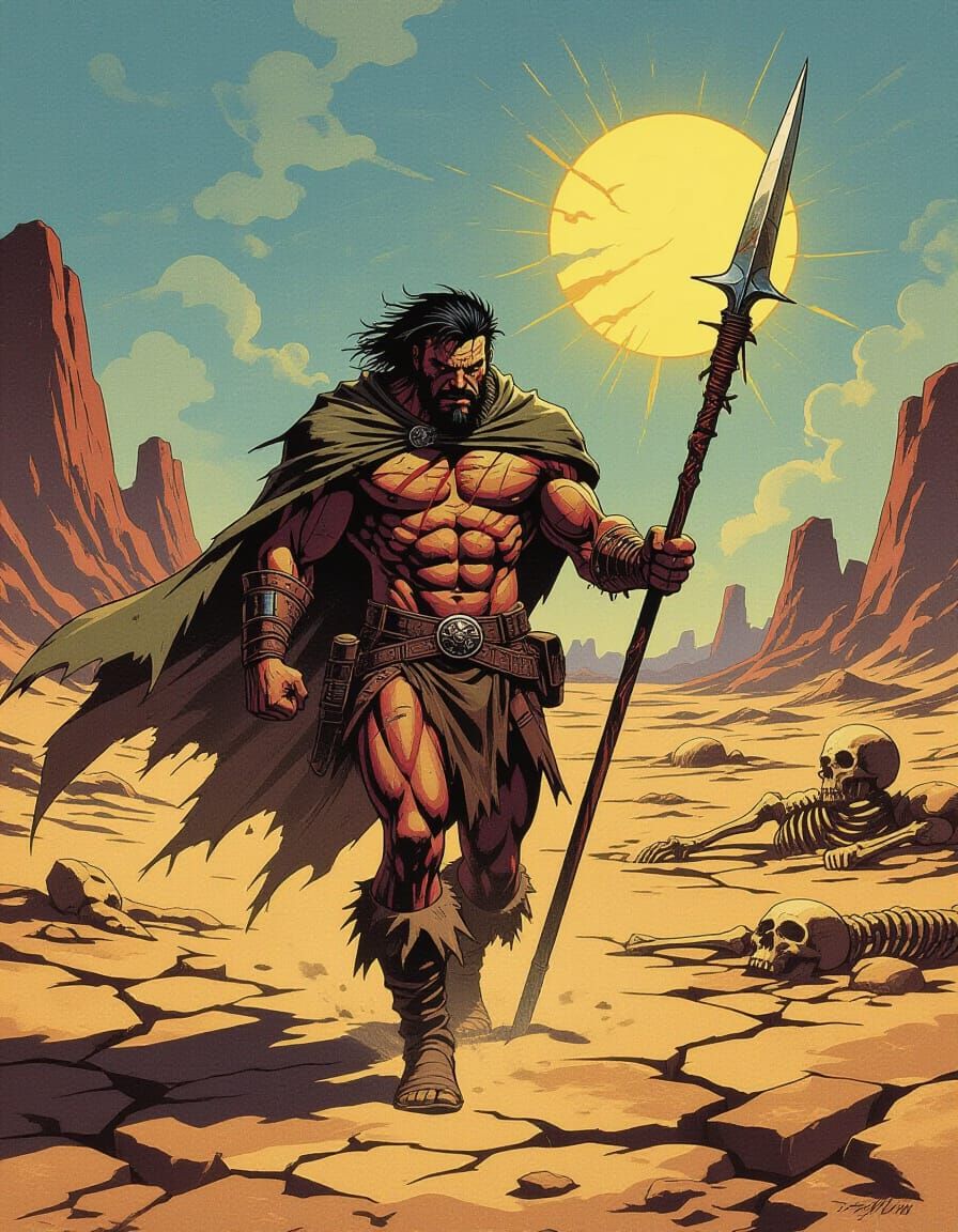 This comic book cover art features a rugged survivor in a desolate wasteland, holding a glowing spear. It captures raw brutality and indomitable spirit with dynamic lighting and exaggerated textures.